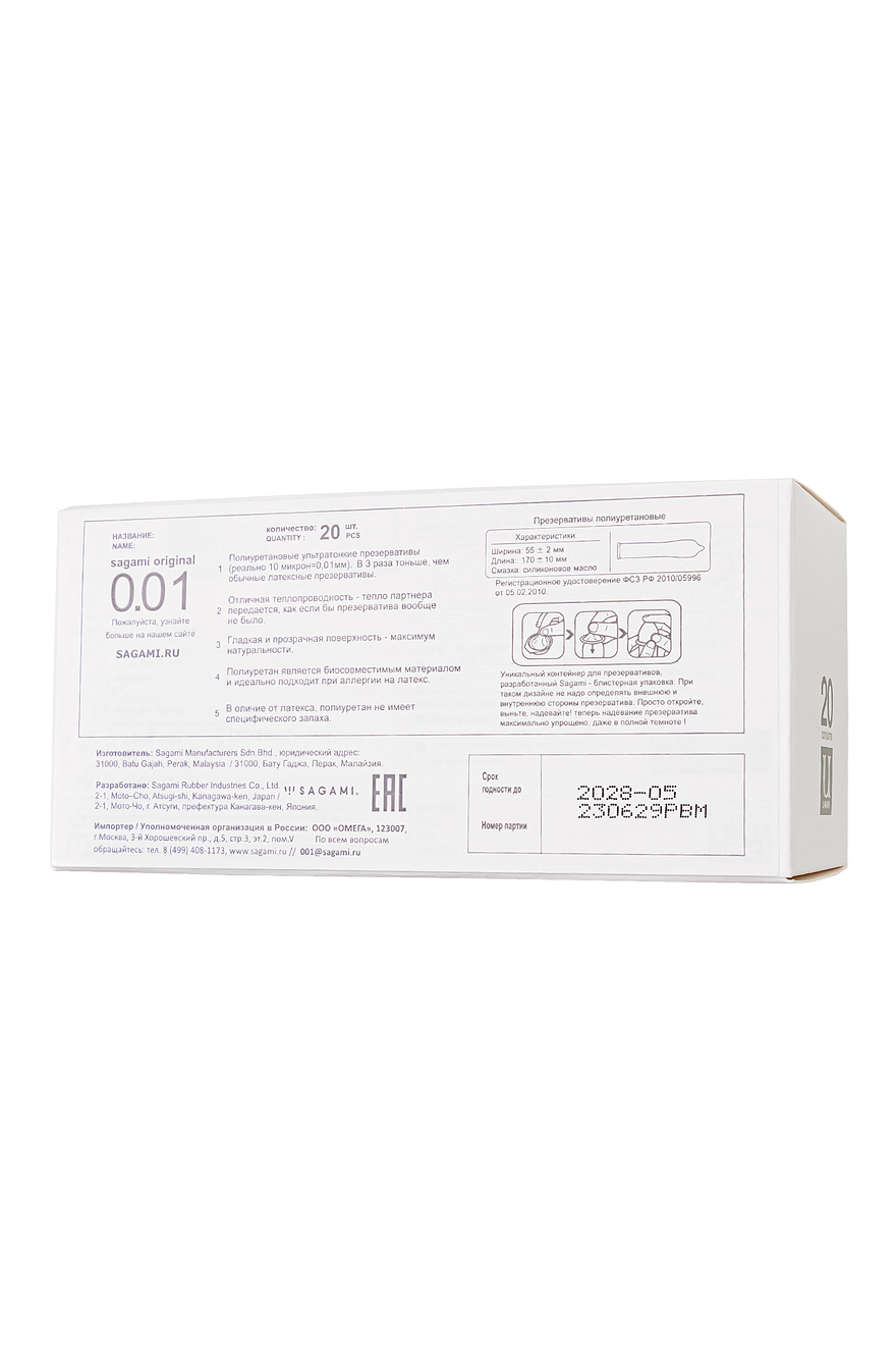Революционные (не побоимся этого слова) презервативы Sagami Original 0.01 произвели такой фурор в Японии, что продаются в другие страны в крайне ограниченных количествах. Нет, производителям их не жалко, просто японцы раскупают их так быстро, что на экспорт практически ничего не остается. Чем же они так хороши? Это новое поколение супертонких полиуретановых презервативов. Толщина в 0,01 мм настолько мала, что позволяет партнерам чувствовать только друг друга, а не презерватив. Несмотря на ультратонкие стенки, Sagami Original 0.01 очень прочны и так же надежно защищают, как их более плотные собратья. Они мгновенно принимают температуру тела человека и придают стимуляции совершенную естественность. Не содержат протеинов и химических катализаторов, а значит, полностью гипоаллергенны и подходят даже людям с аллергией на латекс. Полиуретановые презервативы обладают нейтральным ароматом и не раздражают «резиновым» запахом, как латексные. Берите максимум удовольствия от секса вместе с презервативами Sagami Original 0.01.
