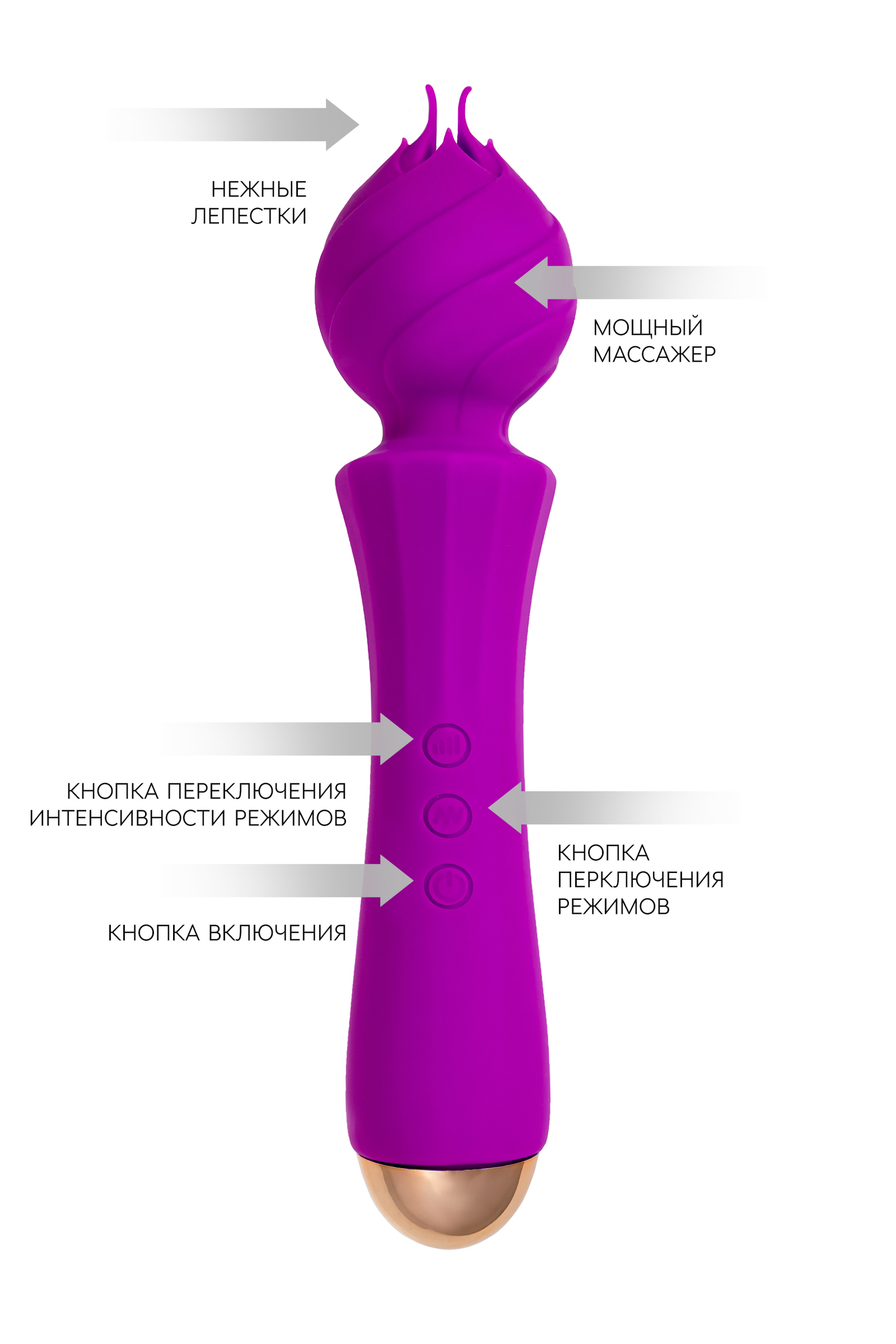 HYACINTH Вибромассажер с лепестками Самая популярная форма вибромассажера дополнена лепестками, которые во время вибрации двигаются и стимулируют эрогенные зоны. Головка массажера гибкая, что позволяет использовать его под разными углами и не отвлекаясь от ярких оргазмов. Изготовлен из высококачественного бархатистого силикона. Заряжается от USB.Время зарядки - 1,5 часа Время работы - 1 час.Рекомендуем использовать до и после применения - дезинфицирующее средство для игрушки и для более ярких оргазмов использовать возбуждающую смазку на водной основе. Хранить при температуре не выше 35 градусов, избегать попадания прямых солнечных лучей.